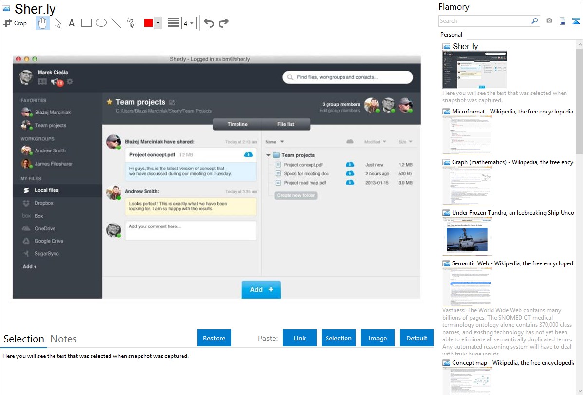 Flamory helps you capture and store screenshots from Sher.ly by pressing a single hotkey. It will be saved to a history, so you can continue doing your tasks without interruptions. Later, you can edit the screenshot: crop, resize, add labels and highlights. After that, you can paste the screenshot into any other document or e-mail message.