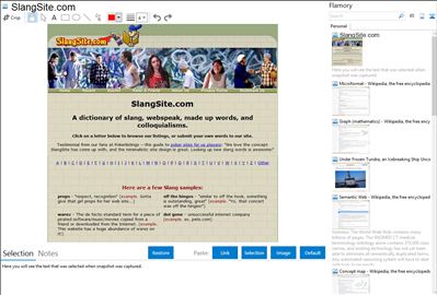 Flamory helps you capture and store screenshots from SlangSite.com by pressing a single hotkey. It will be saved to a history, so you can continue doing your tasks without interruptions. Later, you can edit the screenshot: crop, resize, add labels and highlights. After that, you can paste the screenshot into any other document or e-mail message.