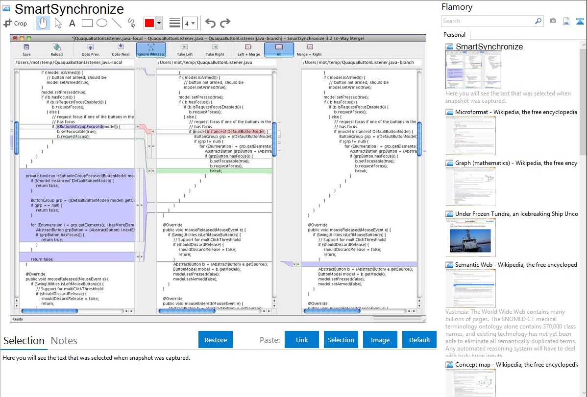 Flamory helps you capture and store screenshots from SmartSynchronize by pressing a single hotkey. It will be saved to a history, so you can continue doing your tasks without interruptions. Later, you can edit the screenshot: crop, resize, add labels and highlights. After that, you can paste the screenshot into any other document or e-mail message.