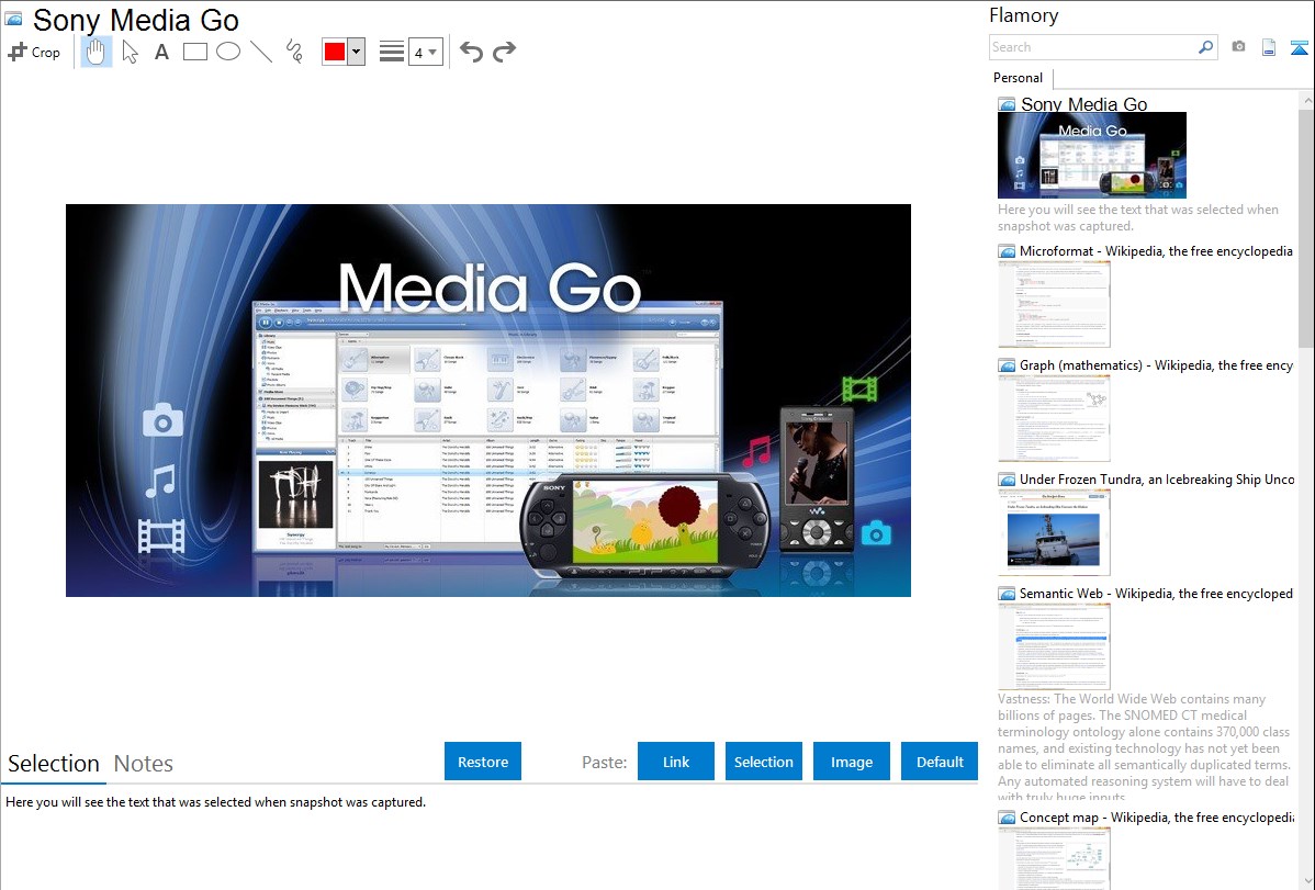 Flamory helps you capture and store screenshots from Sony Media Go by pressing a single hotkey. It will be saved to a history, so you can continue doing your tasks without interruptions. Later, you can edit the screenshot: crop, resize, add labels and highlights. After that, you can paste the screenshot into any other document or e-mail message.