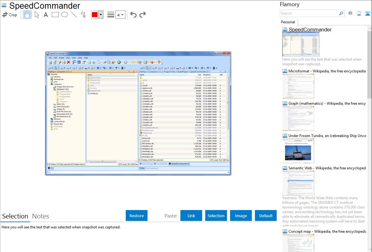 Flamory helps you capture and store screenshots from SpeedCommander by pressing a single hotkey. It will be saved to a history, so you can continue doing your tasks without interruptions. Later, you can edit the screenshot: crop, resize, add labels and highlights. After that, you can paste the screenshot into any other document or e-mail message.