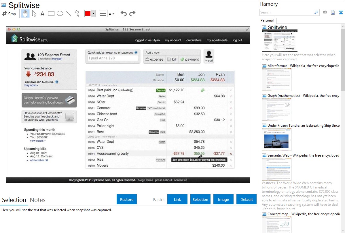 Flamory helps you capture and store screenshots from Splitwise by pressing a single hotkey. It will be saved to a history, so you can continue doing your tasks without interruptions. Later, you can edit the screenshot: crop, resize, add labels and highlights. After that, you can paste the screenshot into any other document or e-mail message.
