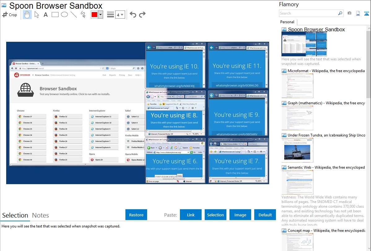 Flamory helps you capture and store screenshots from Spoon Browser Sandbox by pressing a single hotkey. It will be saved to a history, so you can continue doing your tasks without interruptions. Later, you can edit the screenshot: crop, resize, add labels and highlights. After that, you can paste the screenshot into any other document or e-mail message.