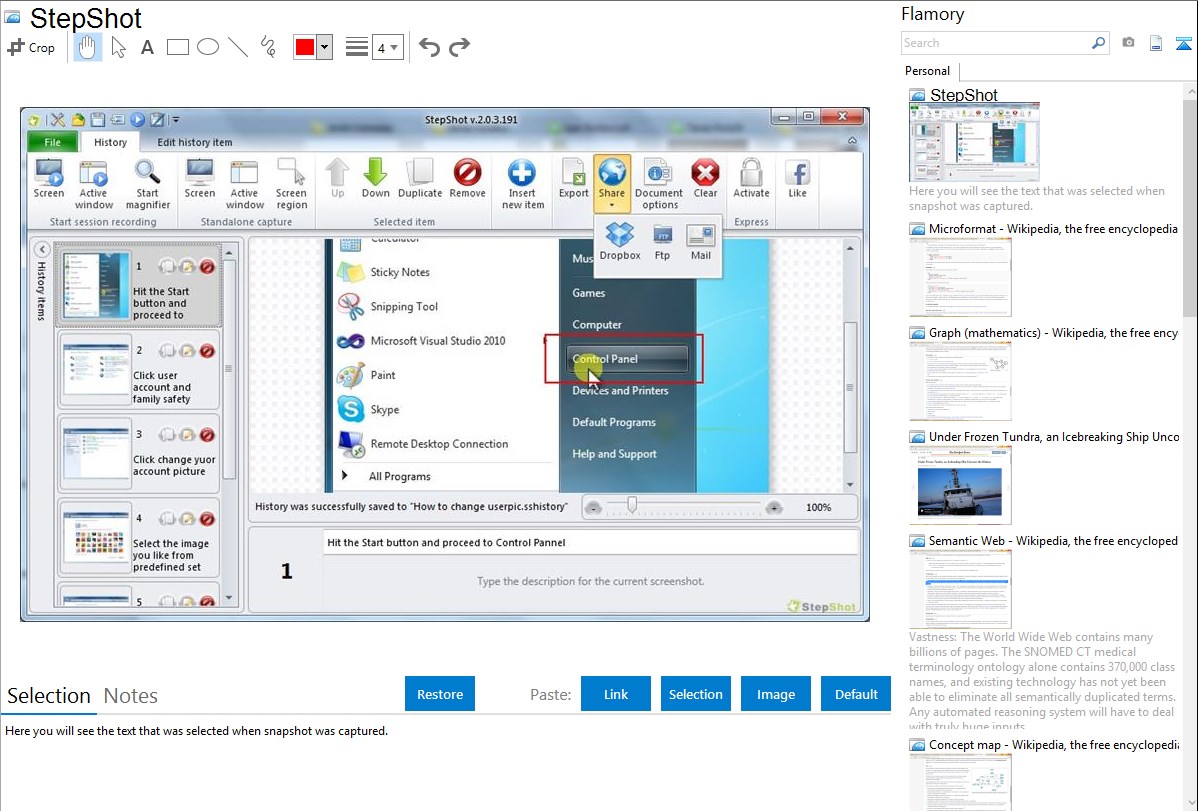 Flamory helps you capture and store screenshots from StepShot by pressing a single hotkey. It will be saved to a history, so you can continue doing your tasks without interruptions. Later, you can edit the screenshot: crop, resize, add labels and highlights. After that, you can paste the screenshot into any other document or e-mail message.