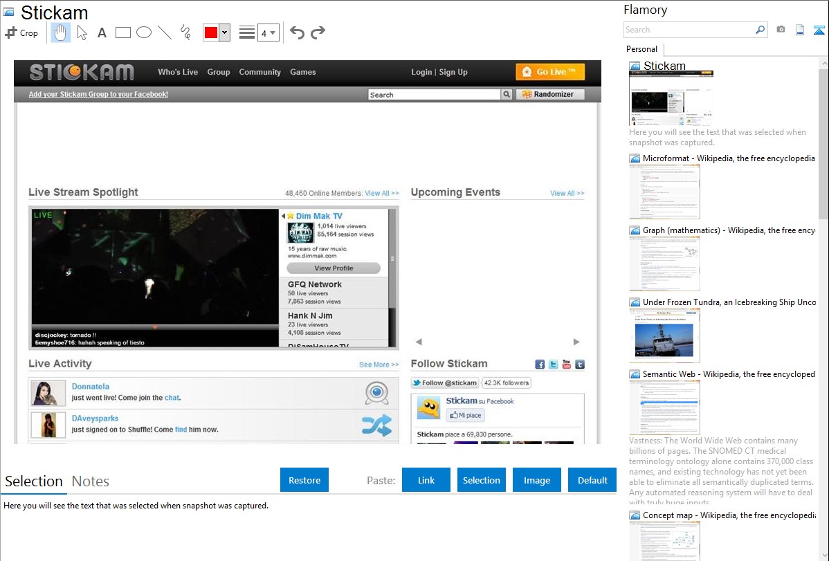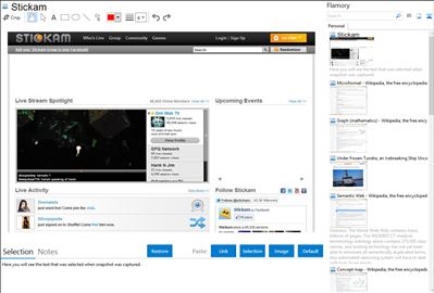 Flamory helps you capture and store screenshots from Stickam by pressing a single hotkey. It will be saved to a history, so you can continue doing your tasks without interruptions. Later, you can edit the screenshot: crop, resize, add labels and highlights. After that, you can paste the screenshot into any other document or e-mail message.