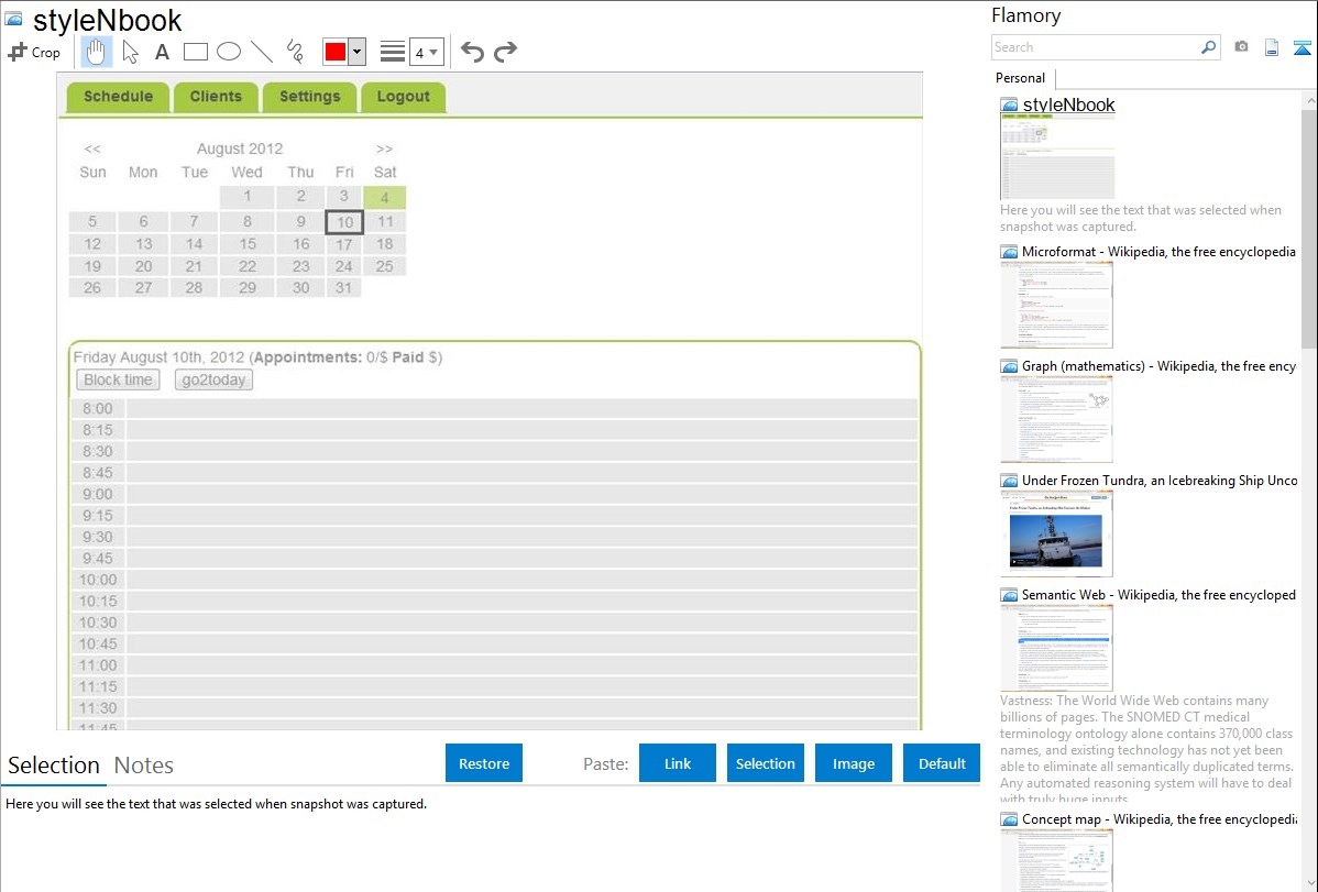 Flamory helps you capture and store screenshots from styleNbook by pressing a single hotkey. It will be saved to a history, so you can continue doing your tasks without interruptions. Later, you can edit the screenshot: crop, resize, add labels and highlights. After that, you can paste the screenshot into any other document or e-mail message.