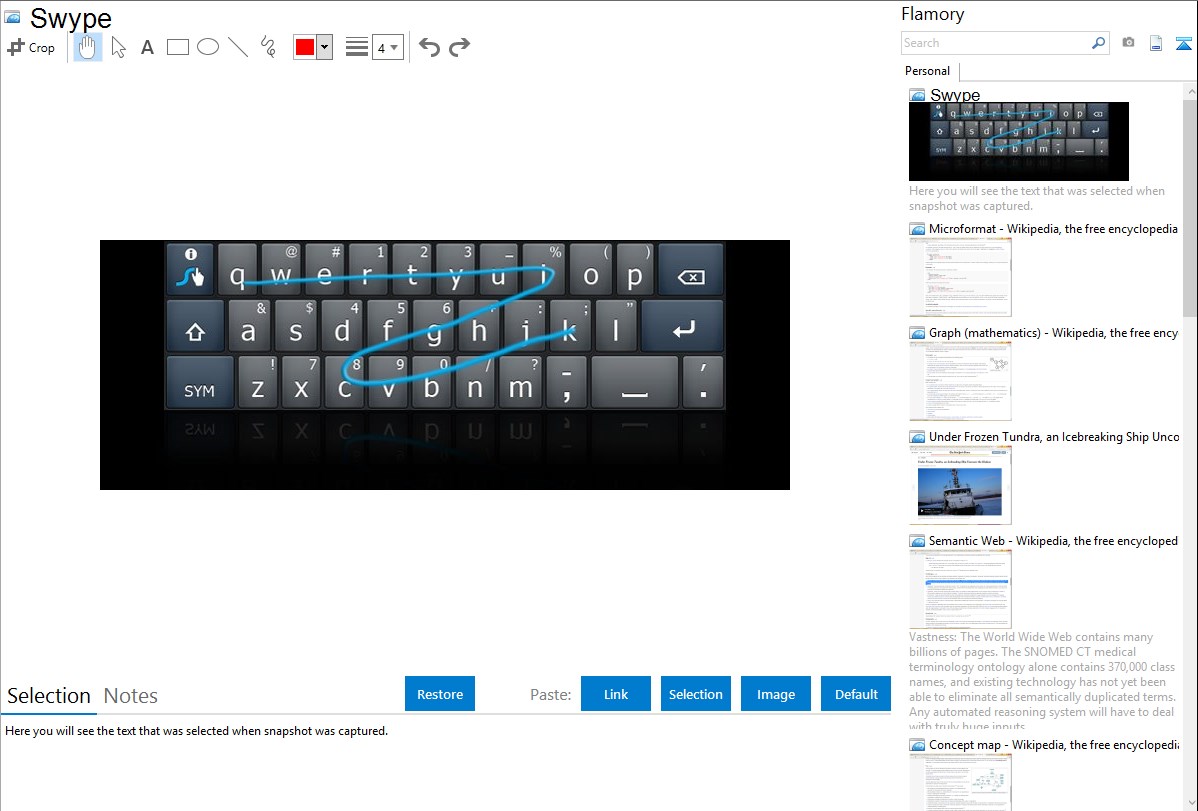 Flamory helps you capture and store screenshots from Swype by pressing a single hotkey. It will be saved to a history, so you can continue doing your tasks without interruptions. Later, you can edit the screenshot: crop, resize, add labels and highlights. After that, you can paste the screenshot into any other document or e-mail message.