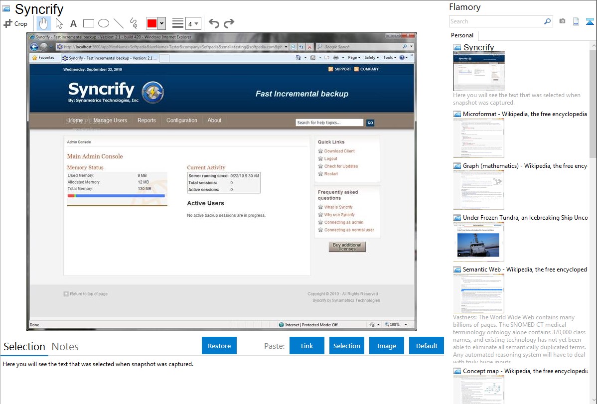 Flamory helps you capture and store screenshots from Syncrify by pressing a single hotkey. It will be saved to a history, so you can continue doing your tasks without interruptions. Later, you can edit the screenshot: crop, resize, add labels and highlights. After that, you can paste the screenshot into any other document or e-mail message.