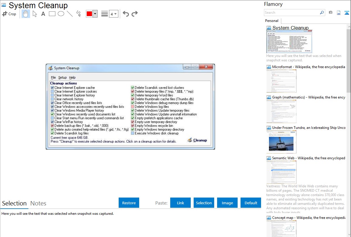 Flamory helps you capture and store screenshots from System Cleanup by pressing a single hotkey. It will be saved to a history, so you can continue doing your tasks without interruptions. Later, you can edit the screenshot: crop, resize, add labels and highlights. After that, you can paste the screenshot into any other document or e-mail message.