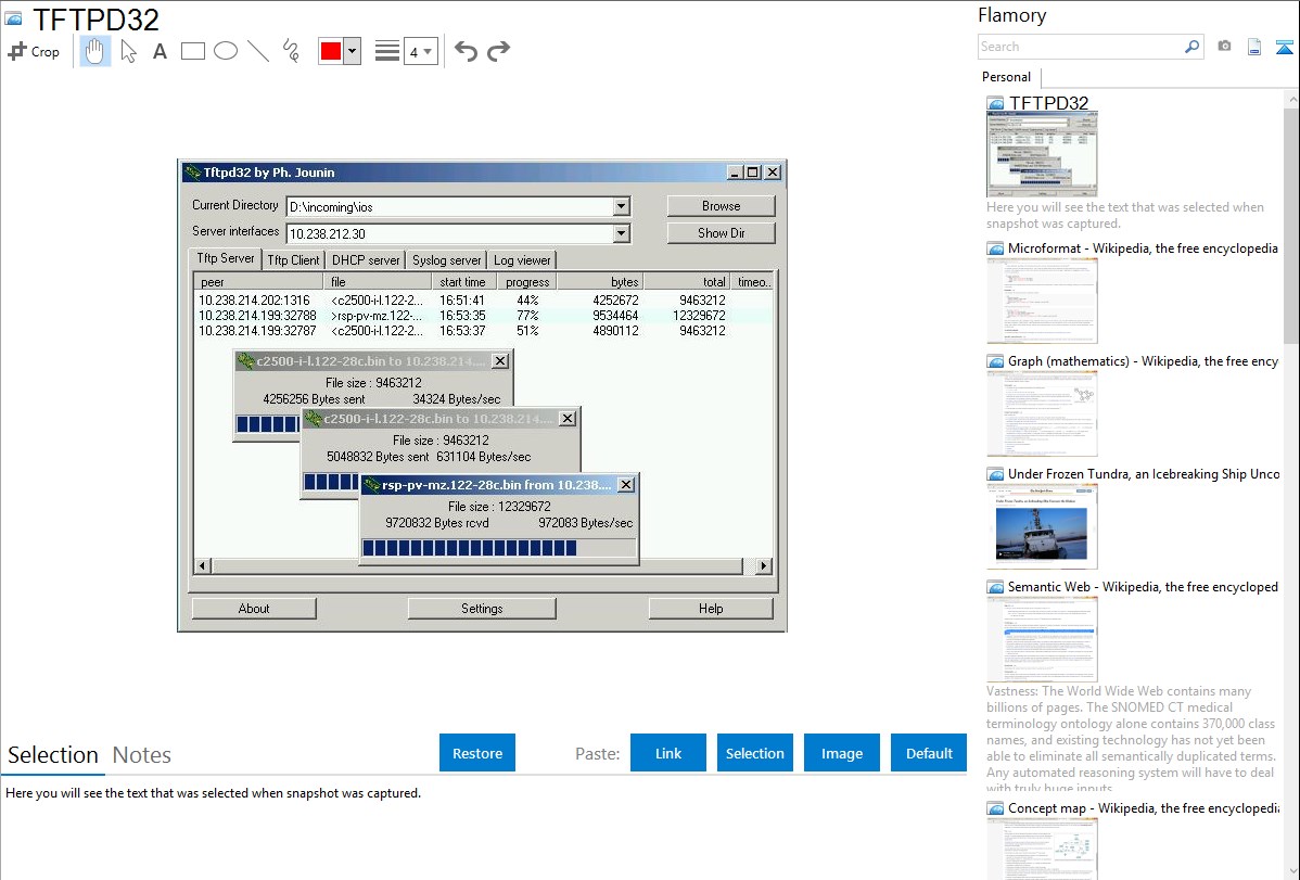 Flamory helps you capture and store screenshots from TFTPD32 by pressing a single hotkey. It will be saved to a history, so you can continue doing your tasks without interruptions. Later, you can edit the screenshot: crop, resize, add labels and highlights. After that, you can paste the screenshot into any other document or e-mail message.