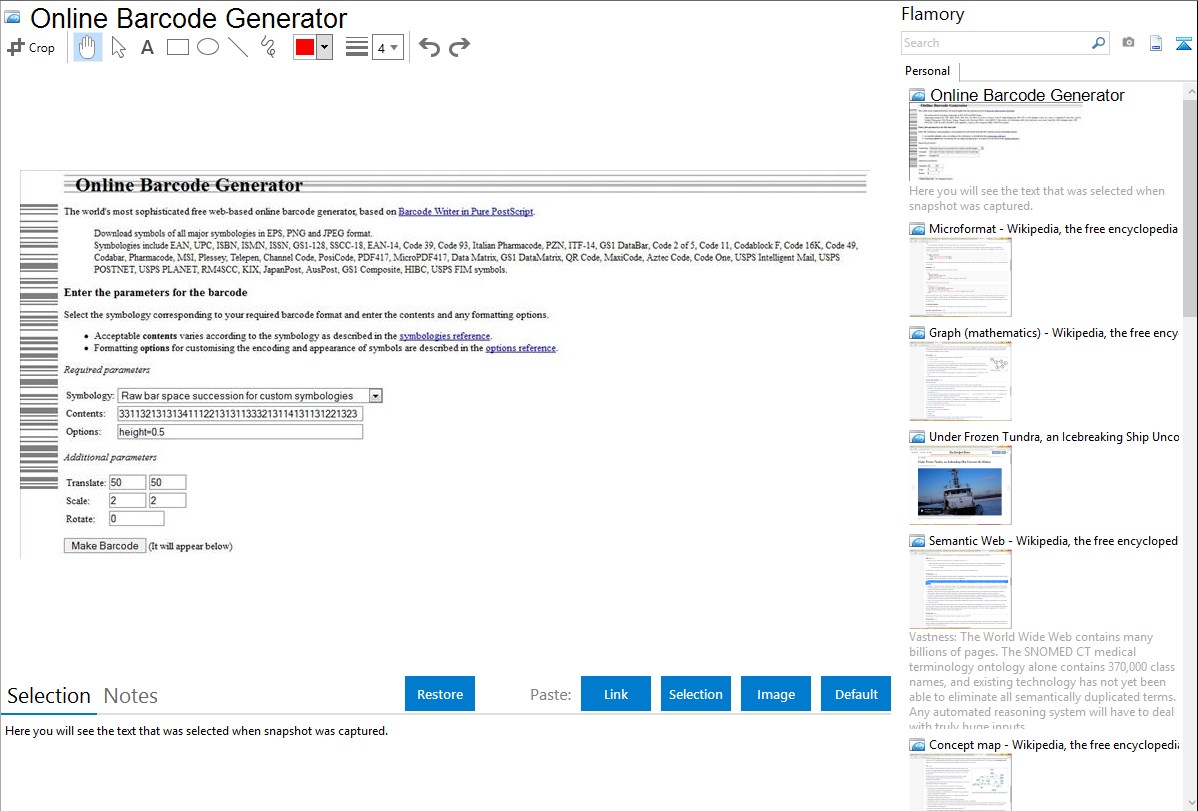 Flamory helps you capture and store screenshots from Online Barcode Generator by pressing a single hotkey. It will be saved to a history, so you can continue doing your tasks without interruptions. Later, you can edit the screenshot: crop, resize, add labels and highlights. After that, you can paste the screenshot into any other document or e-mail message.
