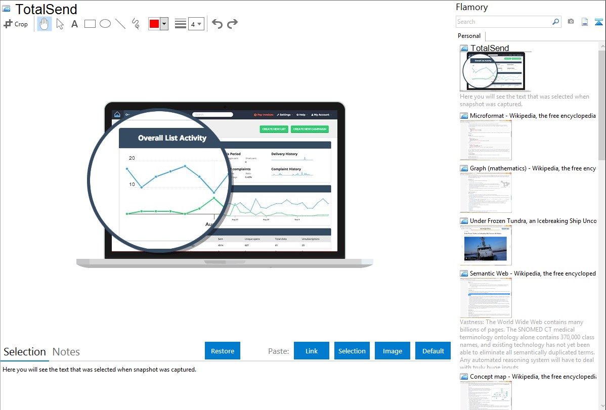 Flamory helps you capture and store screenshots from TotalSend by pressing a single hotkey. It will be saved to a history, so you can continue doing your tasks without interruptions. Later, you can edit the screenshot: crop, resize, add labels and highlights. After that, you can paste the screenshot into any other document or e-mail message.