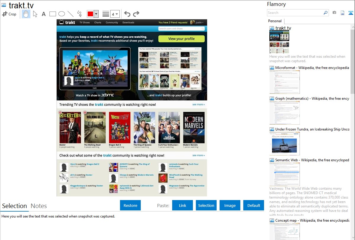 Flamory helps you capture and store screenshots from trakt.tv by pressing a single hotkey. It will be saved to a history, so you can continue doing your tasks without interruptions. Later, you can edit the screenshot: crop, resize, add labels and highlights. After that, you can paste the screenshot into any other document or e-mail message.