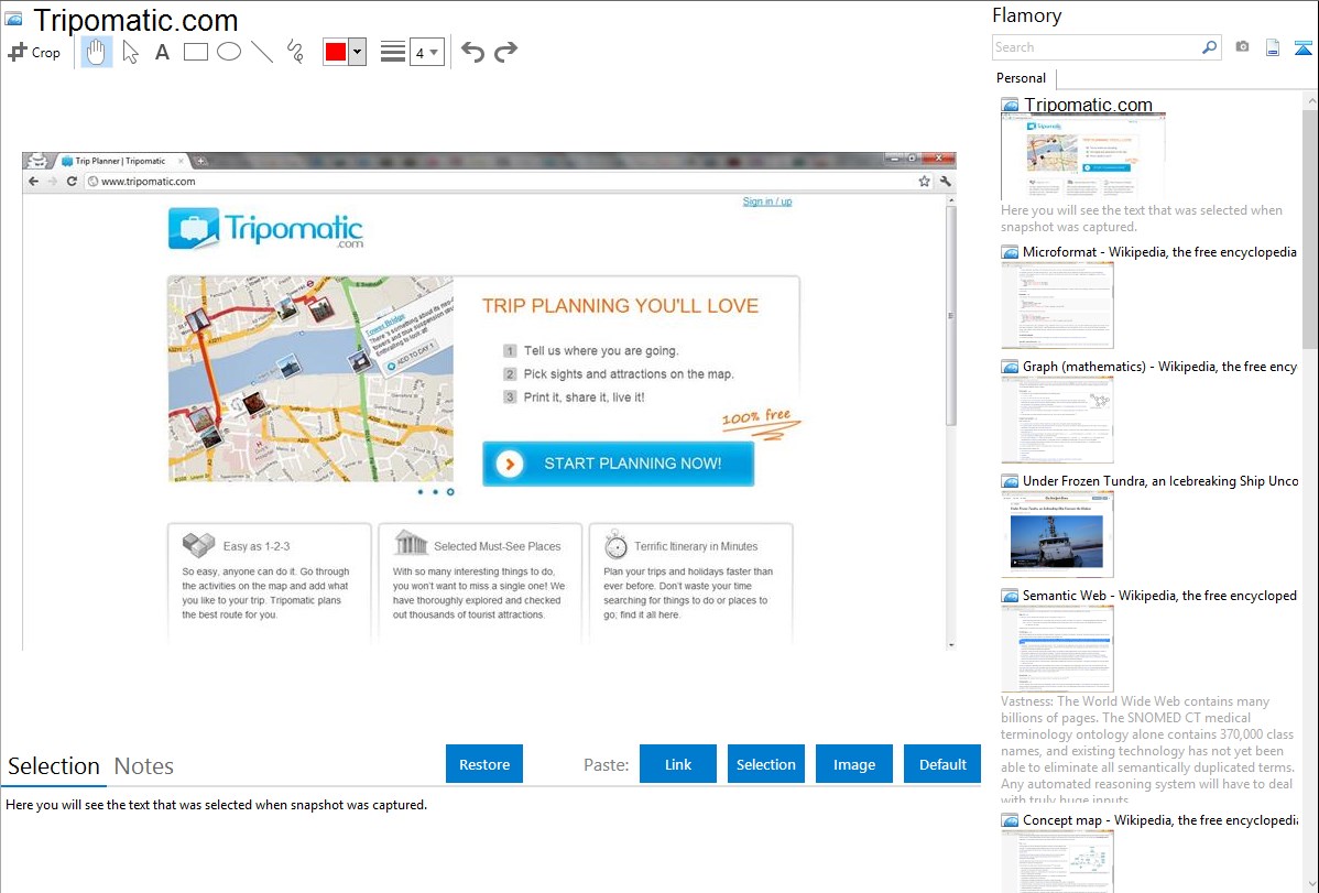 Flamory helps you capture and store screenshots from Tripomatic.com by pressing a single hotkey. It will be saved to a history, so you can continue doing your tasks without interruptions. Later, you can edit the screenshot: crop, resize, add labels and highlights. After that, you can paste the screenshot into any other document or e-mail message.