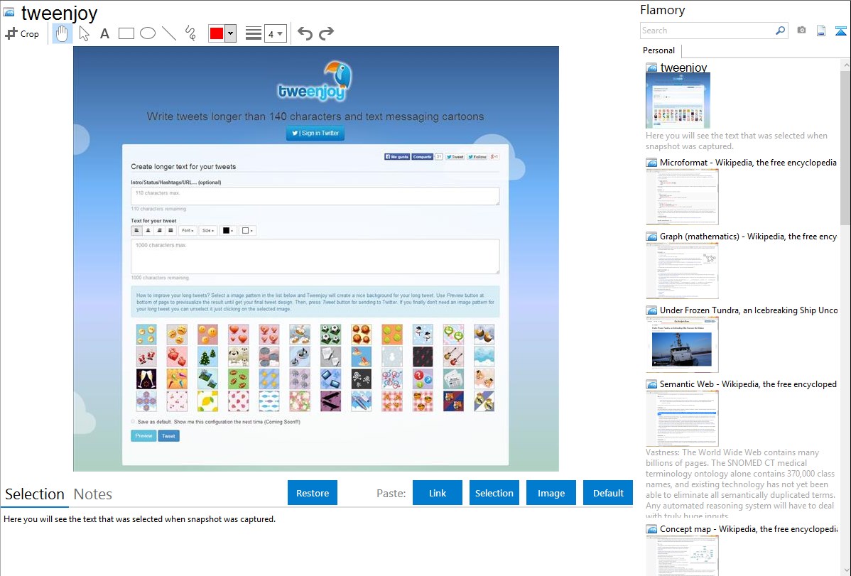 Flamory helps you capture and store screenshots from tweenjoy by pressing a single hotkey. It will be saved to a history, so you can continue doing your tasks without interruptions. Later, you can edit the screenshot: crop, resize, add labels and highlights. After that, you can paste the screenshot into any other document or e-mail message.