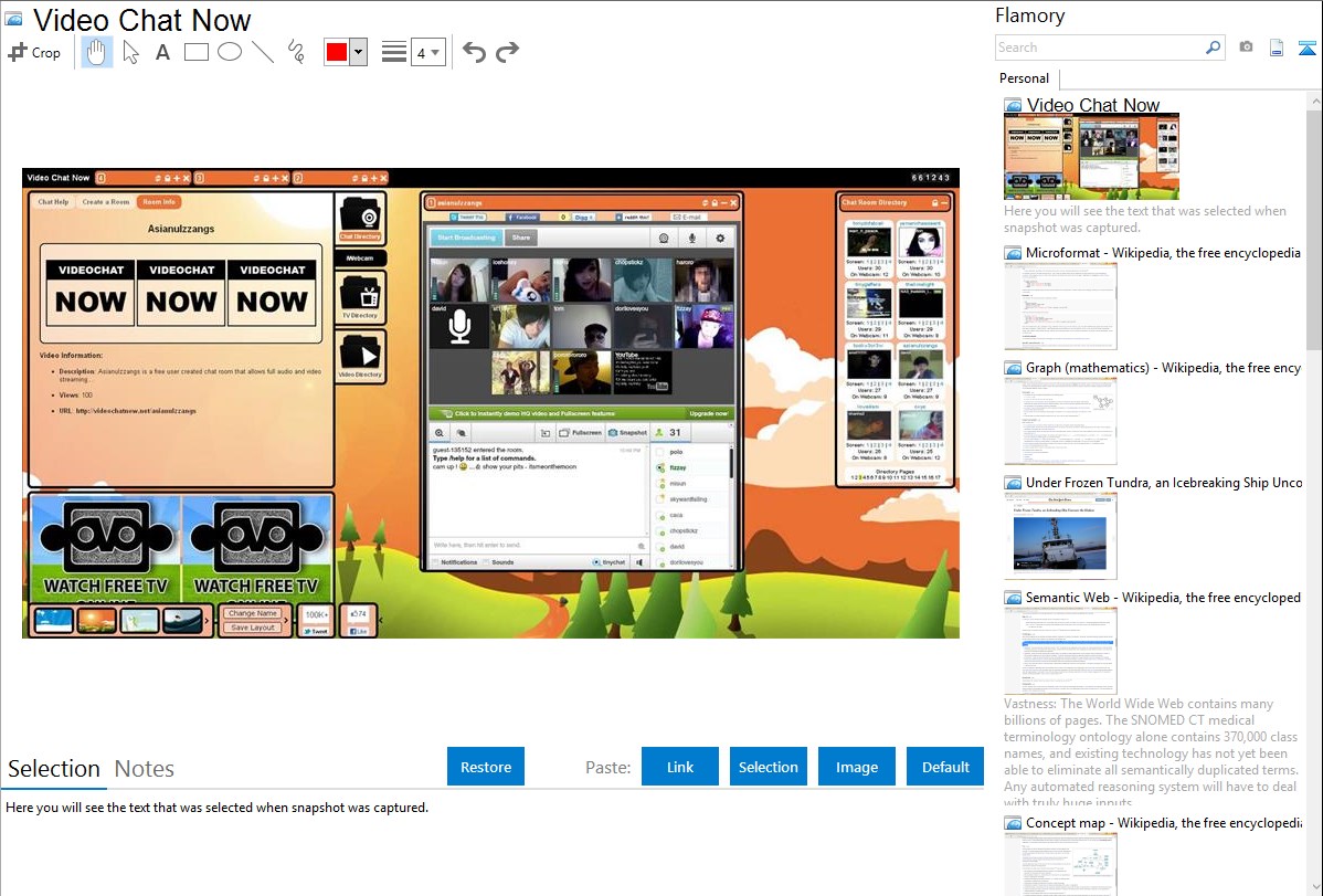 Flamory helps you capture and store screenshots from Video Chat Now by pressing a single hotkey. It will be saved to a history, so you can continue doing your tasks without interruptions. Later, you can edit the screenshot: crop, resize, add labels and highlights. After that, you can paste the screenshot into any other document or e-mail message.