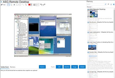 Flamory helps you capture and store screenshots from ASG-Remote Desktop by pressing a single hotkey. It will be saved to a history, so you can continue doing your tasks without interruptions. Later, you can edit the screenshot: crop, resize, add labels and highlights. After that, you can paste the screenshot into any other document or e-mail message.
