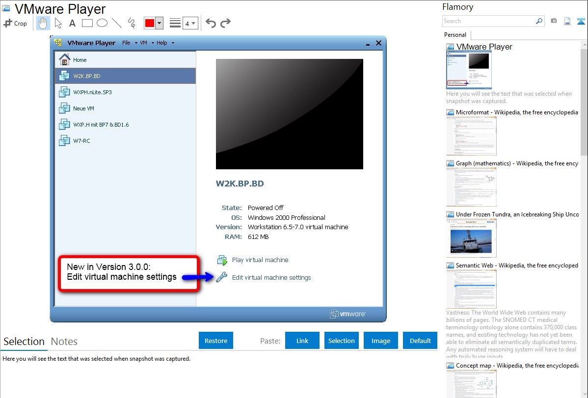 Flamory helps you capture and store screenshots from VMware Player by pressing a single hotkey. It will be saved to a history, so you can continue doing your tasks without interruptions. Later, you can edit the screenshot: crop, resize, add labels and highlights. After that, you can paste the screenshot into any other document or e-mail message.