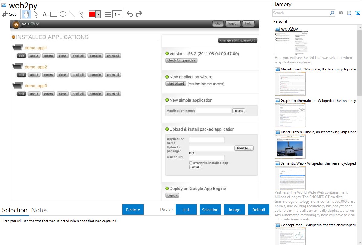 Flamory helps you capture and store screenshots from web2py by pressing a single hotkey. It will be saved to a history, so you can continue doing your tasks without interruptions. Later, you can edit the screenshot: crop, resize, add labels and highlights. After that, you can paste the screenshot into any other document or e-mail message.