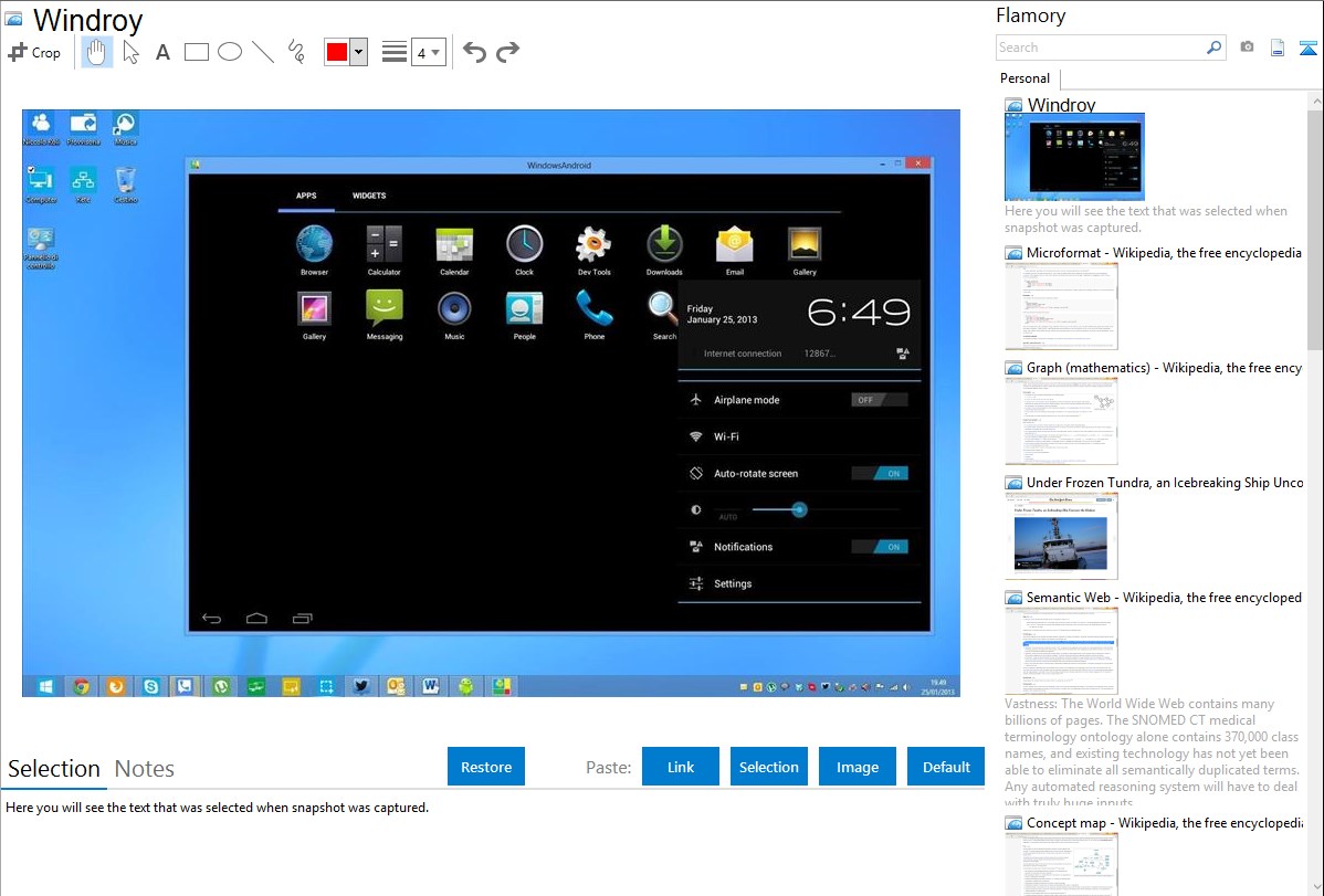 Flamory helps you capture and store screenshots from Windroy by pressing a single hotkey. It will be saved to a history, so you can continue doing your tasks without interruptions. Later, you can edit the screenshot: crop, resize, add labels and highlights. After that, you can paste the screenshot into any other document or e-mail message.