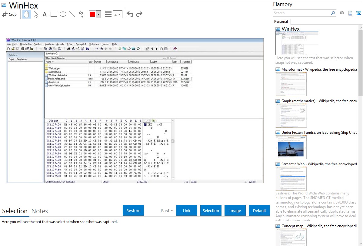 Flamory helps you capture and store screenshots from WinHex by pressing a single hotkey. It will be saved to a history, so you can continue doing your tasks without interruptions. Later, you can edit the screenshot: crop, resize, add labels and highlights. After that, you can paste the screenshot into any other document or e-mail message.